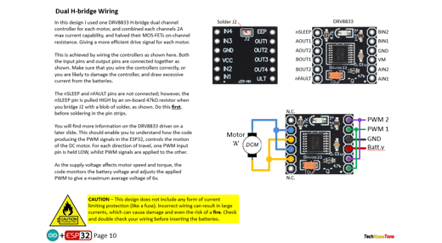 The circuit diagram for the robot is shown here on the left, with the ESP32 connected to the four H-bridge drivers, providing high current PWM for the motors, the ICM-42607-P 3-axis gyroscope and the twelve RGB LEDs, which are connected in a daisy chain fashion. As the motors are only rated up to 6v, I measure the battery voltage and adjust power accordingly. A simple resistor network is used to subdivide the supply voltage so that the ESP32 can measure the voltage remaining in the batteries, which should not be allowed to fall below 3 volts per battery, to avoid damage from deep discharge.