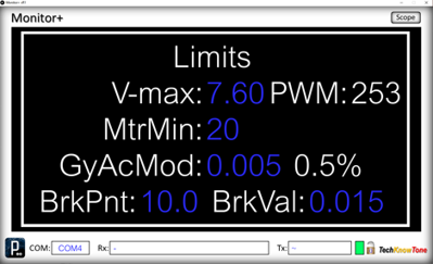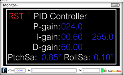 I developed the Monitor+ display and graphing tool app using Processing. This took quite a lot of effort, but the end result makes it very easy to change PID controller setting on the fly, as the robot is moving around, simply by changing numeric fields on the PC screen. You can temporarily note a set of settings you think are close to what you need, make further changes, then re-enter them later if you want them back