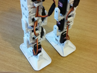 The lower legs consist of plates, to provide mounting frames for the servo motors, and joints for hip, knee and ankle movement. The use of screws makes it easy to maintain the droid, should you wish to disassemble it to replace a part or change its appearance in some way.