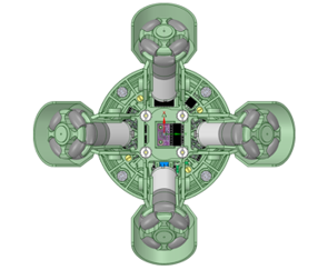 To balance on a ball you need to be able to drive it in any direction, to remain on top of it. This project uses robot omni wheels, which can be driven in one direction whilst rolling freely at right-angles. Four wheels, working in pairs, mounted at 90° to each other can therefore provide movement in any direction. The ICM-42607-P 3-axis gyroscope, and accelerometers, are used to sense the slightest imbalance, which triggers the control system to drive each motor pair to respond to the error. A 2.4 GHz Wi-Fi transceiver link is used with a Wii Nunchuk or Classic, to control the robot, and to convey dynamic data which can be displayed as graphs on a PC screen for detailed analysis, whilst the robot is moving. Click the image on the right to watch a video of this BallBot in action-->