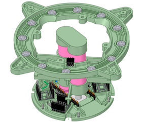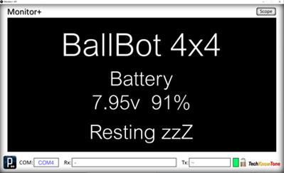 RGB LEDs are mounted on a ring, which provide moving patterns of light to indicate what the robot is doing. For example, when the robot is being moved towards vertical, as its self-balancing trigger point. The graphing app, I mentioned earlier, is also used to tune the robots PID controller, by clicking on variables presented on a PC screen. These adjustments are sent to the robot over the Wi-Fi link and their effect can be seen instantly. The ball size was chosen such that the omni wheels touch it at the 45 degree point, giving a solid grip on the ball, for driving about..