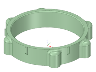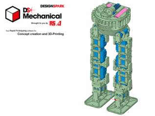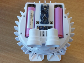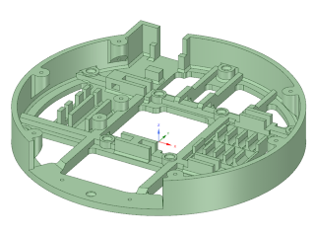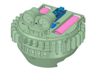 All of the droids components were produced in PLA on my 3-D printer, and modelled using the free design package from RS Components, DesignSpark Mechanical. For this design I also constructed an assembly of the complete robot, to ensure that all of the parts aligned. This included simple models of all bought components like the servo motors and driver board. Given the size limitations of my 3-D printer, the chassis consists of a number of parts screwed together using 2 mm countersunk screws. The top plate has compartments for the two batteries and apertures for socket strips to take the micro and Wi-Fi transceiver. A finned ring surrounds the body to protect it, if it topples over.