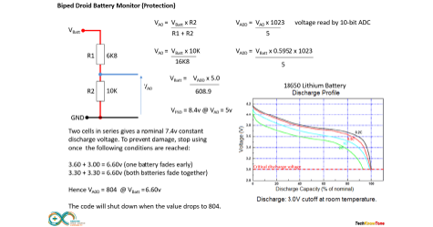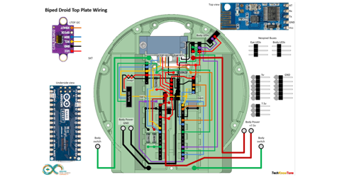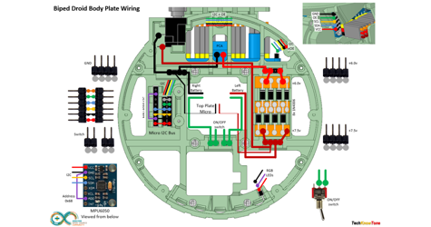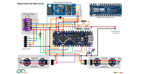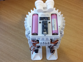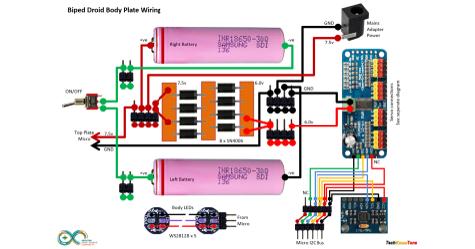 The droid is powered from two 18650 Lithium batteries, delivering 7.4v to the system. An On/OFF switch is mounted at the base of its body, feeding power to the top plate electronics and the PCA9685 servo driver board, mounted on the rear. Two push button switches sit either side of the micro, with the 2.4 GHz wireless transceiver mounted centre of the top plate. Shortly after power-up the droid code drives all servos to their vertical rest positions, allowing it to stand freely with low power.