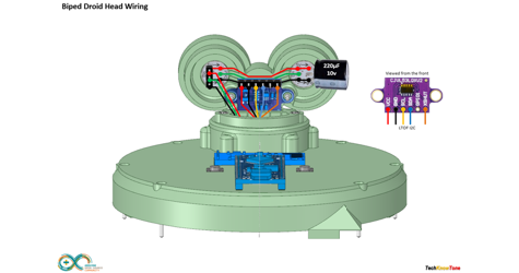 Programmable RGB LEDs are placed in each eye, and 5 in a strip on its front. The colours provide feedback on the modes of operation, and the front LEDs are animated when the droid is in motion. The servo cables are kept tidy with special clips on the rear of each leg. The foot servos need extension leads in order to reach the PCA9685 driver board, as slack is needed when the joints move at large angles..
