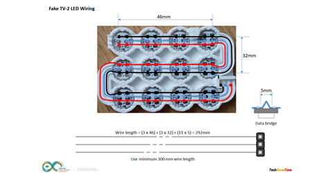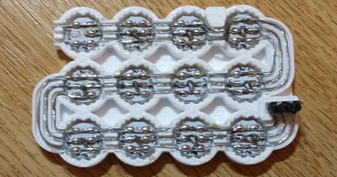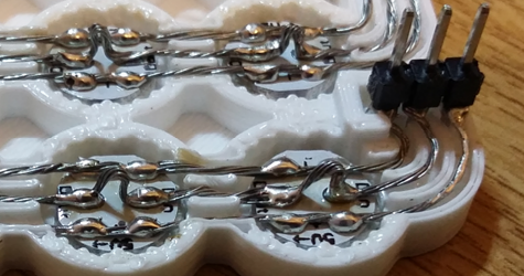 The WS2812B LEDs were wired using stripped multi-strand wire, which is first tinned using a soldering iron and solder to stiffen it. The outer power wires GND and +5v run from one device to the next like bus bars. The centre signalling connection needs to be broken at each LED, so I use a method of kinking the wire, whilst soldering it to the pads; then cropping out the kink with a pair of wire cutters afterwards, as seen in the photos to the left.