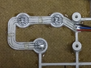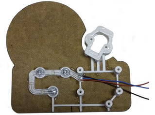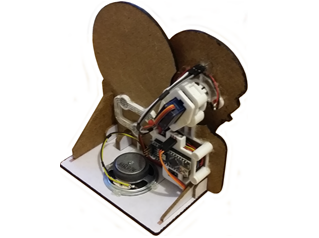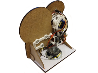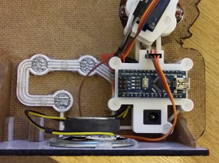The rest of the design was modelled in 3-D and printed in PLA, to provide mounts for the servo motor and the Nano microcontroller. The NeoPixel LEDs were mounted in printed cups using soft-melt glue, with the three tinned wires being fed round a track way to prevent them from touching each other. Soft-melt glue was also used to secure the 64 ohm speaker in place. 3 mm Nylon screws hold the assembly together and the wooden parts are glued together with UniBond No More Nails. As this glue sets clear and is water resistant I also brush it over the graphics to give them a tough gloss finish.