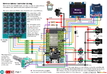 The circuit diagram for the control box is shown here on the left, with the ESP32 connected to the microSD card and display, as well as a rotary encoder, to provide a simple menu system on the display. As the ESP32 board runs at 3.3 volts, and the WS2812B LEDs run at 5 volts, there is an issue of incompatibility which has to be resolved with a level shifter circuit. This is solved by using single WS2812B LEDs in the controller, powered from the 5 volt rail, but through diodes. This intermediate voltage supply ensures that the ESP32 can drive this LED, and it in turn can drive the first LED in the LED matrix. Problem solved reliably!