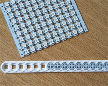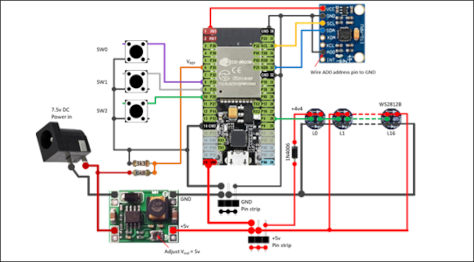 Take great care when soldering the WS2812B RGB LEDs, and glue them into position first to enable soldering. Also observe the legends on the chips, showing the direction of control data and power pins. Adjust the voltage regulator to 5v before plugging in the ESP32 microcontroller. The 5v regulator takes the strain of providing current to the LED strip.