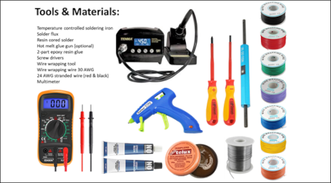 The circuit diagram for the Magical Sword II project is shown here on the left, along with images of the tools and materials you will need, and wiring schematics, The base of the handle houses the three button switches, which are wired separately at first, beofre being connected to the main elecotronics, housed in the handle.