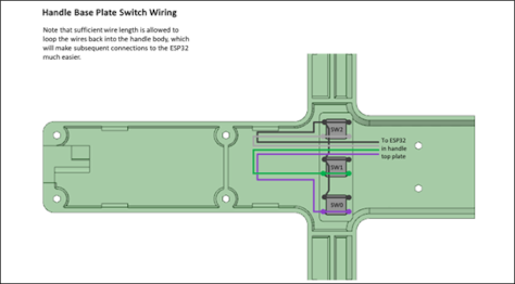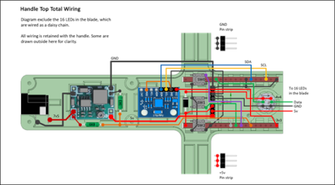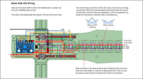 The sword is designed to be powered from an external 7.4v power source; either batteries or a mains adapter. As this makes the sword itself much lighter to use and demonstrate. The microcontroller is clearly visible on the outside, and this makes it easier to apply code to it. I have provided a simple wirings diagram guide, which should give you sufficient information to build this project. Components are either held together with 2-part epoxy glue, or screwed together using M2 x 10mm dolls house screws. I would recommend teh use of wire wrap wire, and a wrapping tool, as that will enable you to test your sword before finally soldering the connections.