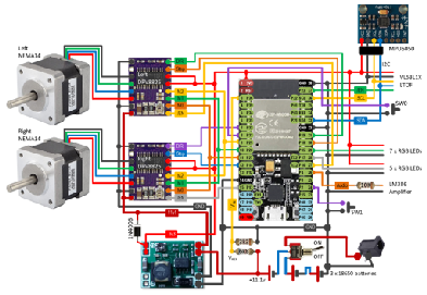 The circuit diagram for the robot is shown here on the left, with the ESP32 connected to the two stepper motor drivers, the MPU 6050A 3-axis gyroscope and two button switches. As the RGB LEDs can draw a relatively large current from the 3v3 supply rail, this design uses a 3v3 buck voltage regulator, to step-down the 11.1v battery voltage needed by the NEMA14 stepper motors. A resistive voltage divider feeds the microcontrollers ADC with a sample of the battery voltage, keeping a close eye on battery voltage.
