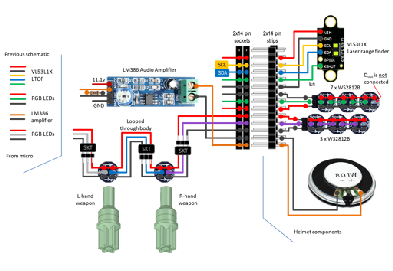 This design mounts the electronic components on a chest plate, so they are easily connected together using wire wrap technology. Whilst this approach requires a small amount of investment up front, it makes the wiring process very straight forward, and has the advantage that the built unit can be tested before final soldering.