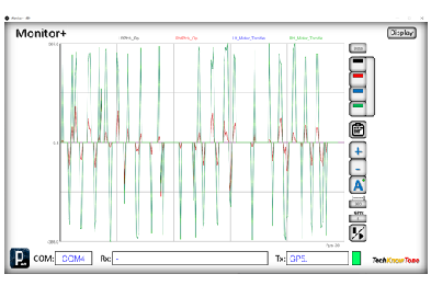 Demo - as the role of this robot is to act as a demonstrator, it is possible to adjust or even switch OFF the gains in the PID controller using the Monitor+ app. This enables you to demonstrate the effects of the proportional, integral and derivative terms of the PID controller. You can also display variables and even plot them in real time; showing gyro response to the robot being pushed for example
